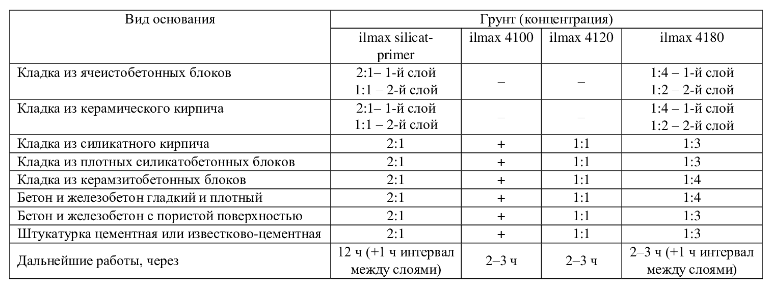 Основание должно быть прочным, стабильным, сухим, ровным, без наледи (инея) и очищенным от биопоражений, высолов, пыли, масел (в том числе опалубочного), жира, остатков краски, гипса, цементного (гипсового) молочка и других загрязнений, способных снизить адгезию. Впитывающее основание загрунтовать ilmax 4180 (4120, 4100) или ilmax silicat-primer в соответствии с инструкцией. Для слабовпитывающего использовать ilmax ready primer грунт-подложка.Приступить к шпатлеванию после высыхания грунта (ориентировочно через 3 часа при применении ilmax 4180 (4120, 4100) / ilmax ready primer грунт-подложка или через 12 часов при применении ilmax silicat-primer).